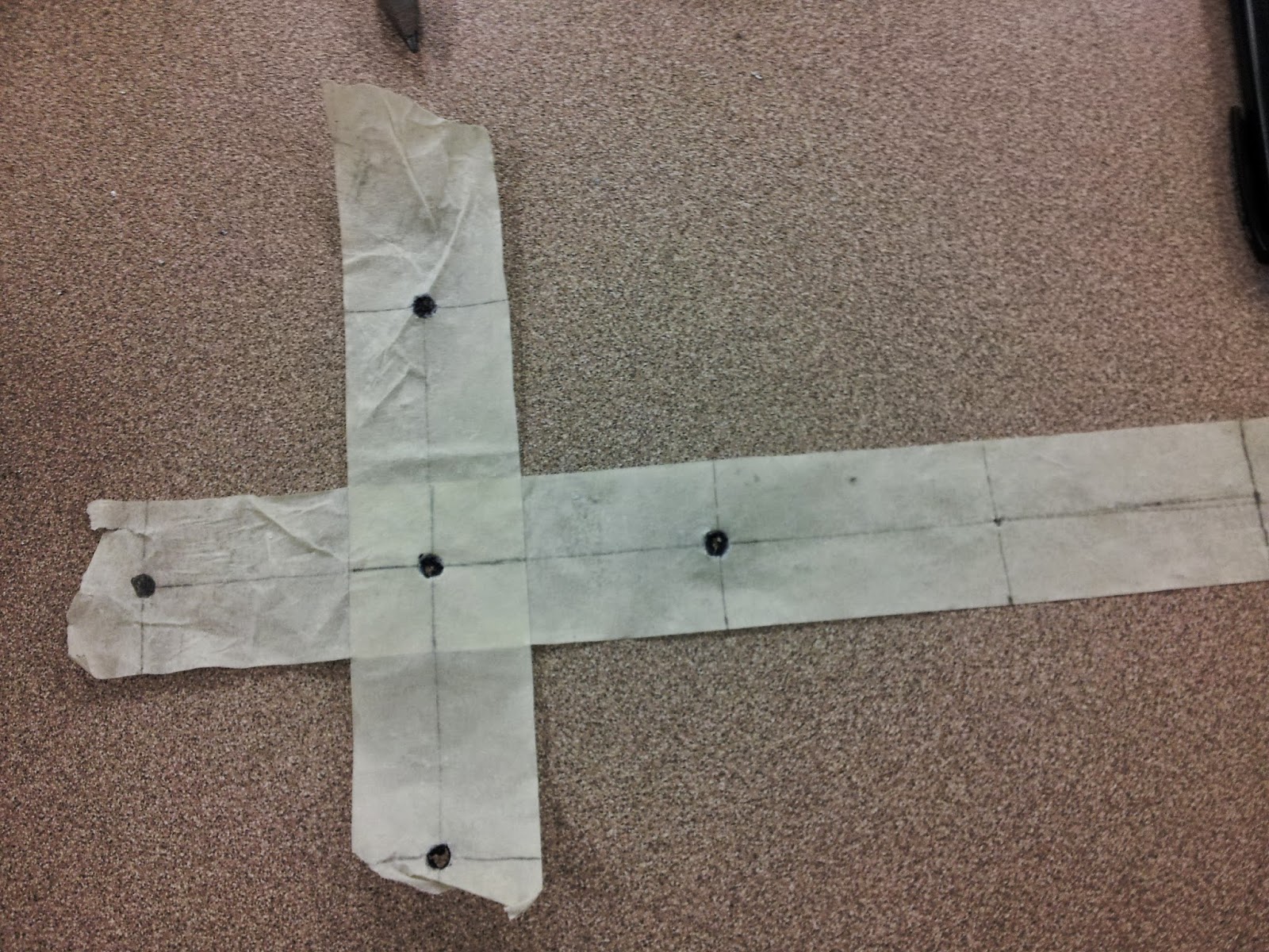 It was difficult to figure out how to get the exact points. So in order to determine where the poles are, we used a piece of tape and measure since we did not have a clothing tape measurer. The two pictures below show what was drawn on the tap to measure.