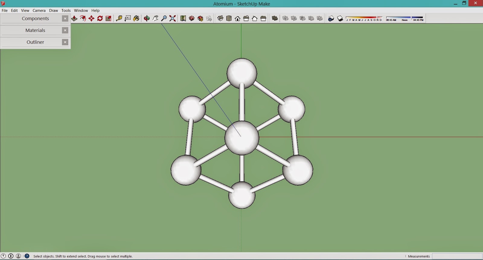 This week Dan was focused on making progress on the SketchUp CAD representation of the Atomium monument. Seen here are the frontal and top views of the model as of 4/22/14. The model consists of the tilted cube with nine spheres, one located at each corner and one in the center. There are several features still missing, including the base of the building, details on the interior of the spheres, windows, and the three supporting bipods.